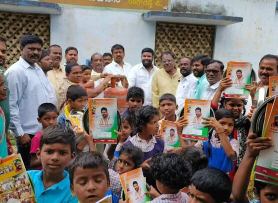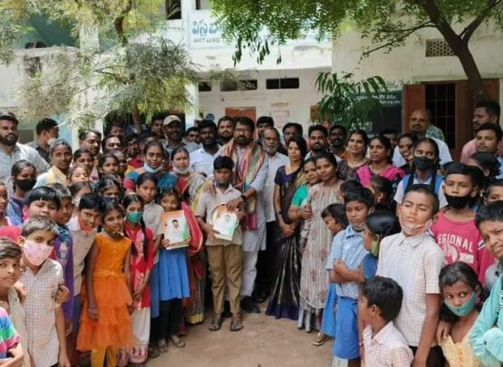 Madhura Charitable Trust Chairman Ragidi Laxma Reddy distributed note books plates to